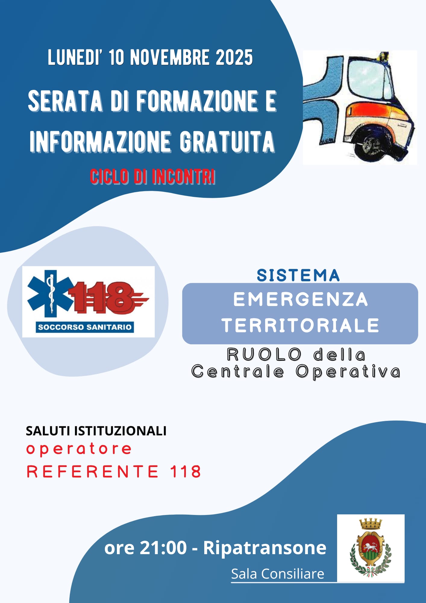 Nell’ambito del ciclo di incontri dedicati alla formazione e all’informazione sanitaria, si terrà una serata di approfondimento sul sistema di emergenza territoriale 118, lunedì 10 novembre 2025 alle ore 21:00 presso la Sala Consiliare del Comune di Ripatransone.