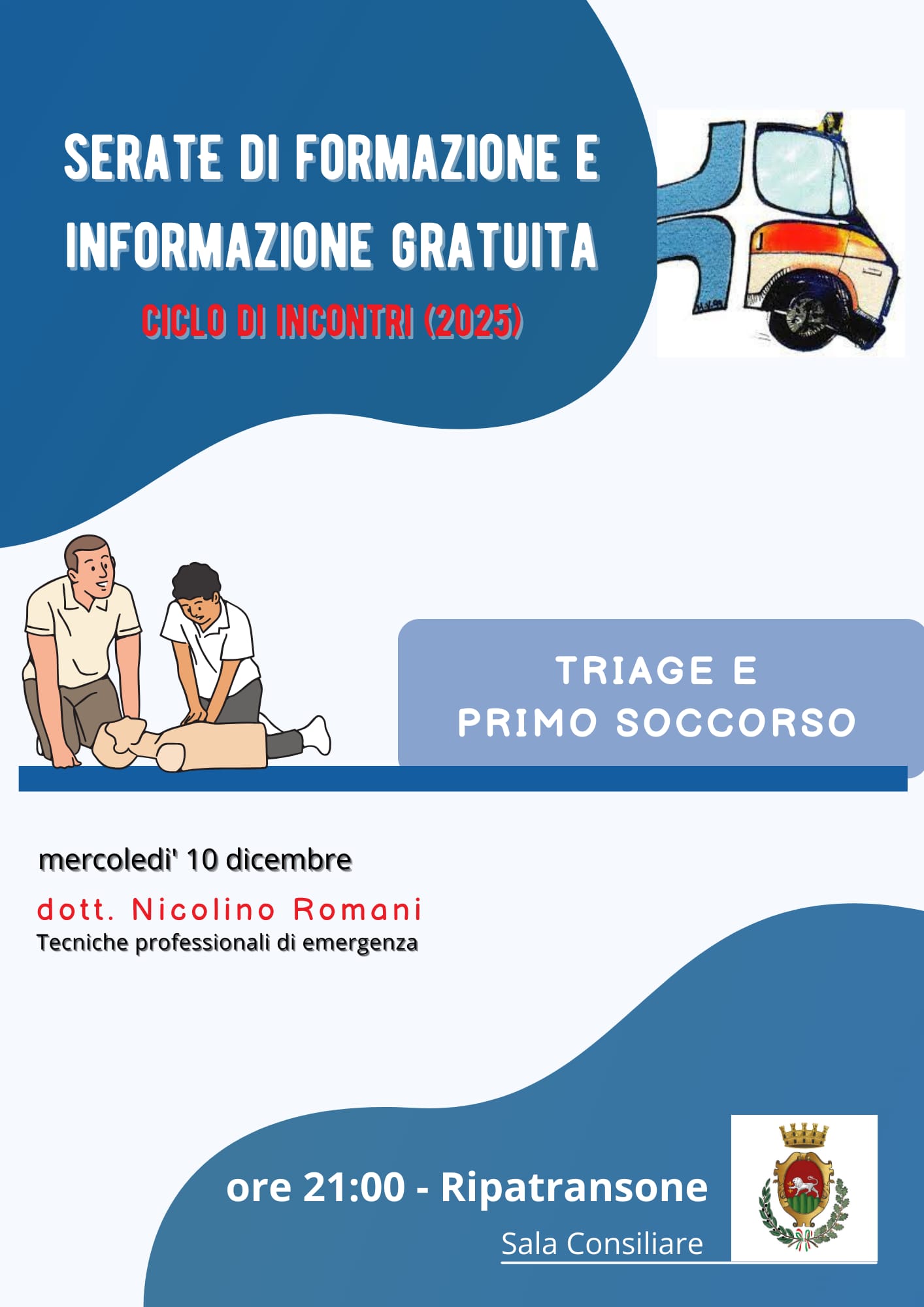 Mercoledì 10 dicembre 2025, alle ore 21:00, presso la Sala Consiliare del Comune di Ripatransone, si terrà l’ultimo appuntamento del ciclo di incontri dedicato alla formazione e informazione sanitaria. Relatore della serata sarà il Dott. Nicolino Romani, che affronterà il tema delle tecniche generali di primo soccorso nelle emergenze.