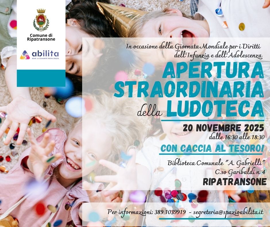 Si avvisa la cittadinanza che giovedì 20 novembre, dalle ore 16:30 alle 18:30, si terrà un’apertura straordinaria della Ludoteca Comunale con una caccia al tesoro, presso la Biblioteca Comunale “A. Gabrielli”, in Corso Garibaldi n. 4, in occasione della Giornata Mondiale per i Diritti dell’Infanzia e dell’Adolescenza.