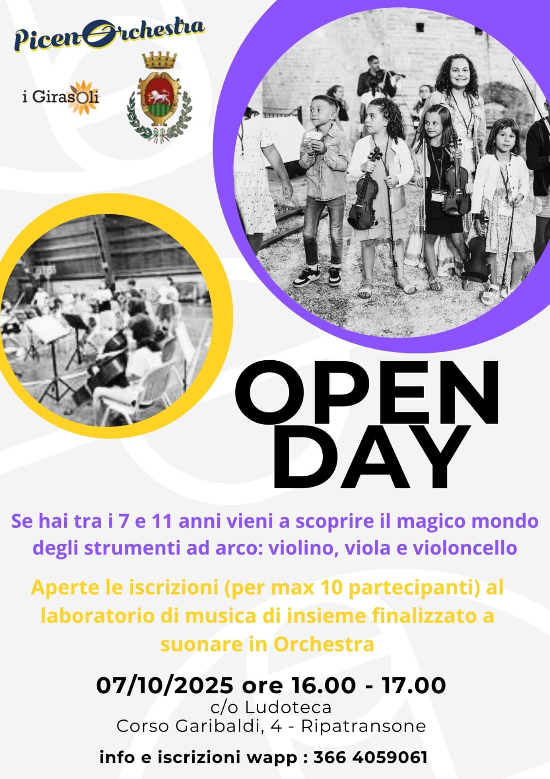 Si avvisa la cittadinanza che l’Associazione I Girasoli, con il patrocinio del Comune di Ripatransone, promuove un’iniziativa musicale rivolta ai più piccoli: un Open Day per la presentazione di un laboratorio di musica di insieme, finalizzato a suonare in Orchestra.
